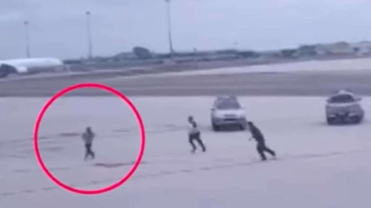 In der Aufnahme ist zu sehen, wie Flughafenmitarbeiter und Airport-Pick-up-Trucks den Mann über das Rollfeld jagen. Anschließend rennt er in Richtung Passagierterminal, kann das Gebäude jedoch nicht betreten, da die Türen verschlossen sind. Schließlich wird er von Flughafenbeamten überwältigt und festgenommen.