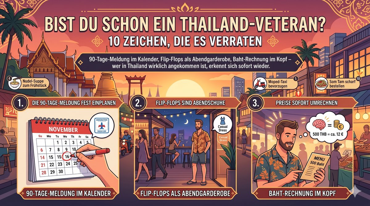 Irgendwann passiert es. Man sitzt am Stammtisch, hört einem Neuankömmling zu, der aufgeregt von Thailand schwärmt – und merkt: Man nickt nicht mehr. Man lächelt nur noch. Das ist der Moment, in dem man zum Thailand-Veteran geworden ist. Ob man es schon ist, zeigen diese zehn Zeichen.