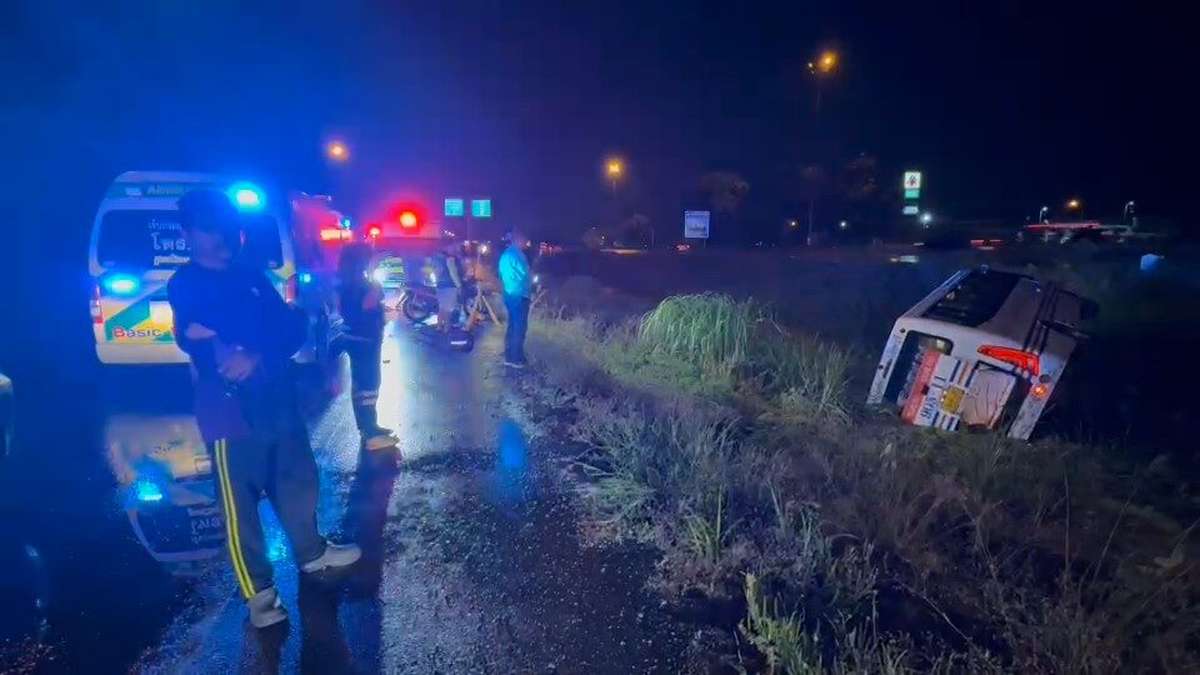 Am Unfallort fand die Polizei einen weißen Minibus der Bangkok-Singburi Linie auf der Seite liegend in einem Wassergraben vor. Auf der Fahrbahn waren lange Schleuderspuren zu erkennen, die bis zum Straßenrand führten. Die Muang Phuthaisawan Foundation eilte zur Unfallstelle, um den Verletzten zu helfen.