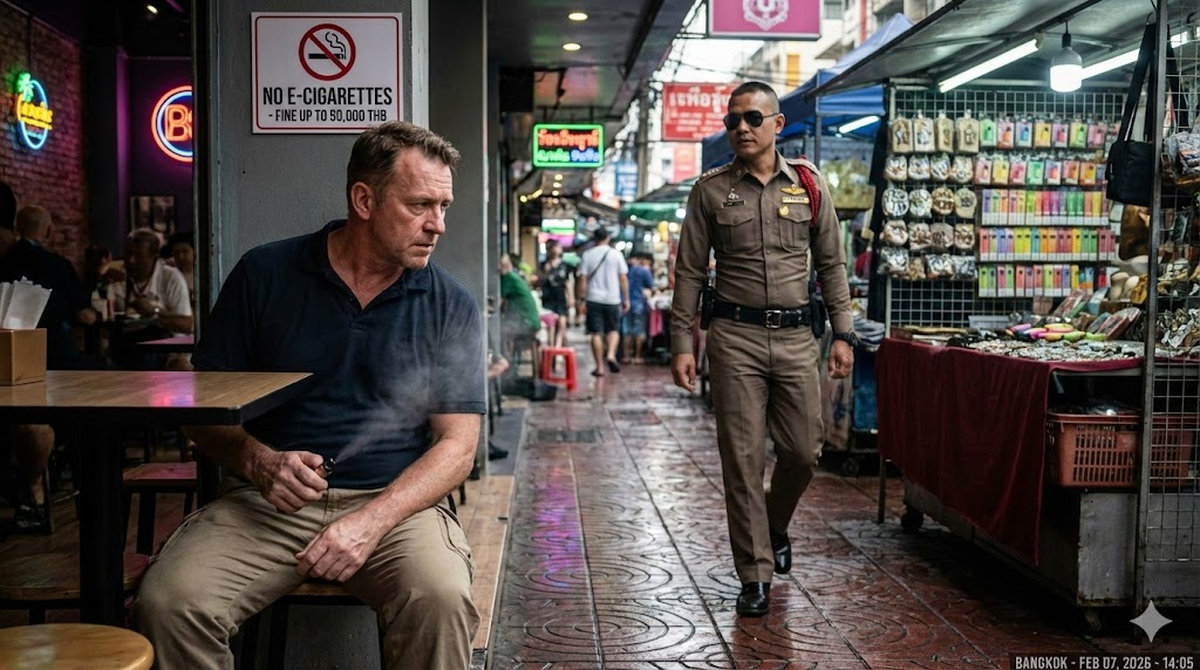 Eine Polizeistreife nähert sich. Innerhalb von Sekunden kippt die entspannte Urlaubsstimmung in Anspannung. Denn was viele Besucher nicht wissen: E-Zigaretten sind im thailändischen Königreich seit 2014 komplett verboten. Der Besitz allein ist strafbar – unabhängig davon, ob man dampft oder das Gerät nur in der Tasche trägt.