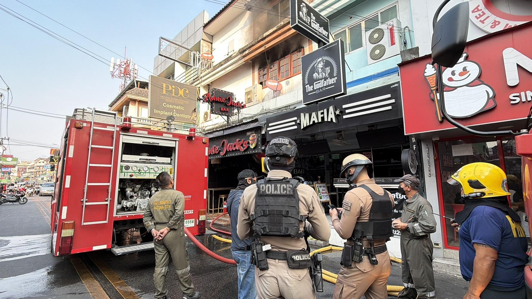 Einsatzkräfte der Feuerwehr und Beamte der Pattaya City Police trafen kurz darauf vor einem dreistöckigen Geschäftsgebäude in einer Reihe miteinander verbundener Einheiten im belebten Entertainment-Viertel ein.