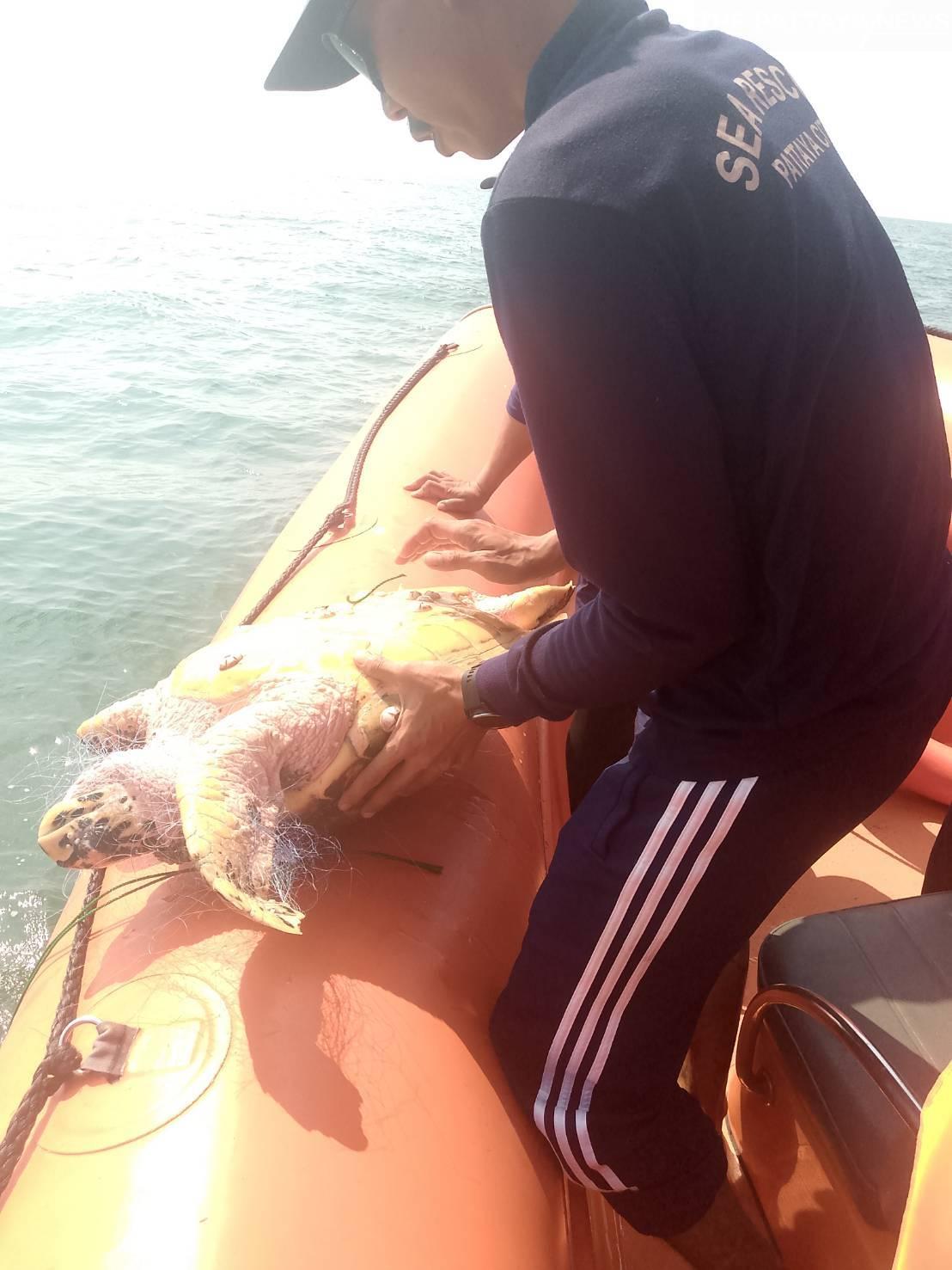 PATTAYA, THAILAND – Eine stark im Fischernetz verfangene Meeresschildkröte ist am Neujahrstag in der Bucht von Pattaya in einer zeitkritischen Aktion gerettet worden.