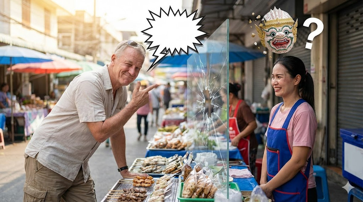 Am Markt in Bangkok macht ein westlicher Besucher eine sarkastische Bemerkung. Die thailändische Verkäuferin wendet den Blick ab und reagiert sichtlich verunsichert. Was im Westen als schlagfertig gilt, führt hier zu einer unangenehmen Situation. Der Besucher versteht nicht, was passiert ist, während sein Gegenüber sich zurückzieht.