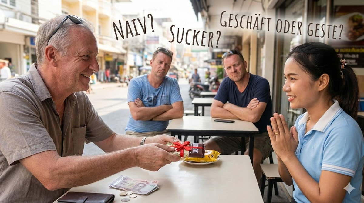 Ein Café in Pattaya, kurz nach zehn Uhr morgens. Ein Mann Mitte fünfzig bestellt zwei Kaffee und schiebt ein bunt verpacktes Stück Kuchen über den Tisch zu seiner Begleitung. Sie lächelt und bedankt sich mit einem eleganten „Wai“. Kostenpunkt: schlappe 80 Baht, also etwa 2,15 Euro. Keine große Sache, oder? Doch am Nebentisch werden Blicke getauscht, die schärfer sind als das Besteck. Das stumme Urteil: „Und da sitzt wieder einer von denen, die es einfach nicht raffen.“
