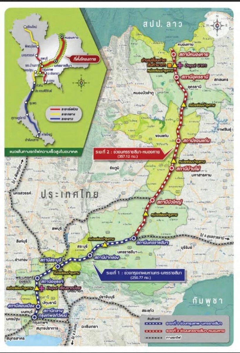 Die erste Phase (Bangkok–Nakhon Ratchasima) ist bereits zu 45,65 % fertiggestellt und soll 2029 in Betrieb gehen. Die zweite Phase (Nakhon Ratchasima–Nong Khai) befindet sich in der Planungsphase, mit einem geschätzten Budget von 340 Milliarden Baht (ca. 10 Mrd. US-Dollar). Die vollständige Fertigstellung ist für 2031 vorgesehen.