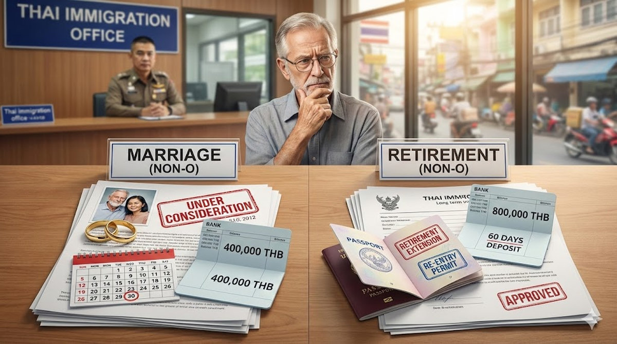 Der Mann überlegt nun, den Grund für seine Verlängerung zu ändern. Statt der Ehe will er den Ruhestand (Retirement) als Grund angeben. In Thailand ist das Visum (das man für die Einreise nutzt) und die Verlängerung (damit man bleiben darf) nämlich nicht dasselbe.