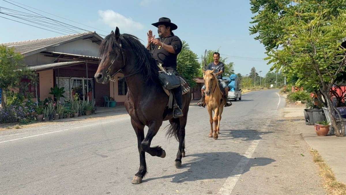 ANG THONG, THAILAND – Auf einem Pferdehof im Bezirk Sawaeng Ha sucht der Betreiber San Kongwet Treibstoff auf ungewöhnliche Weise: zu Pferd, mit Kanister, durch die Dorfstraßen. Der Benzinmangel legt nicht nur Fahrzeuge lahm, sondern bringt auch die Fütterung der Tiere durcheinander und trifft damit einen Betrieb, der von verlässlicher Logistik lebt.