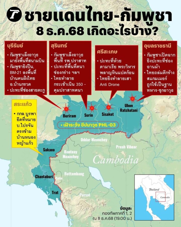 Die Militärregion 2 berichtet über intensive Kampfhandlungen: Kambodschanische Streitkräfte griffen mit über 80 Drohnenflügen und BM-21-Raketen Grenzgebiete in Ubon Ratchathani und Si Sa Ket an. Ziele waren Bereiche wie der Hügel 677, Phu Makhue und Gebiete nahe dem Preah Vihear-Tempel. Die Berichte sind derzeit nicht unabhängig bestätigt.