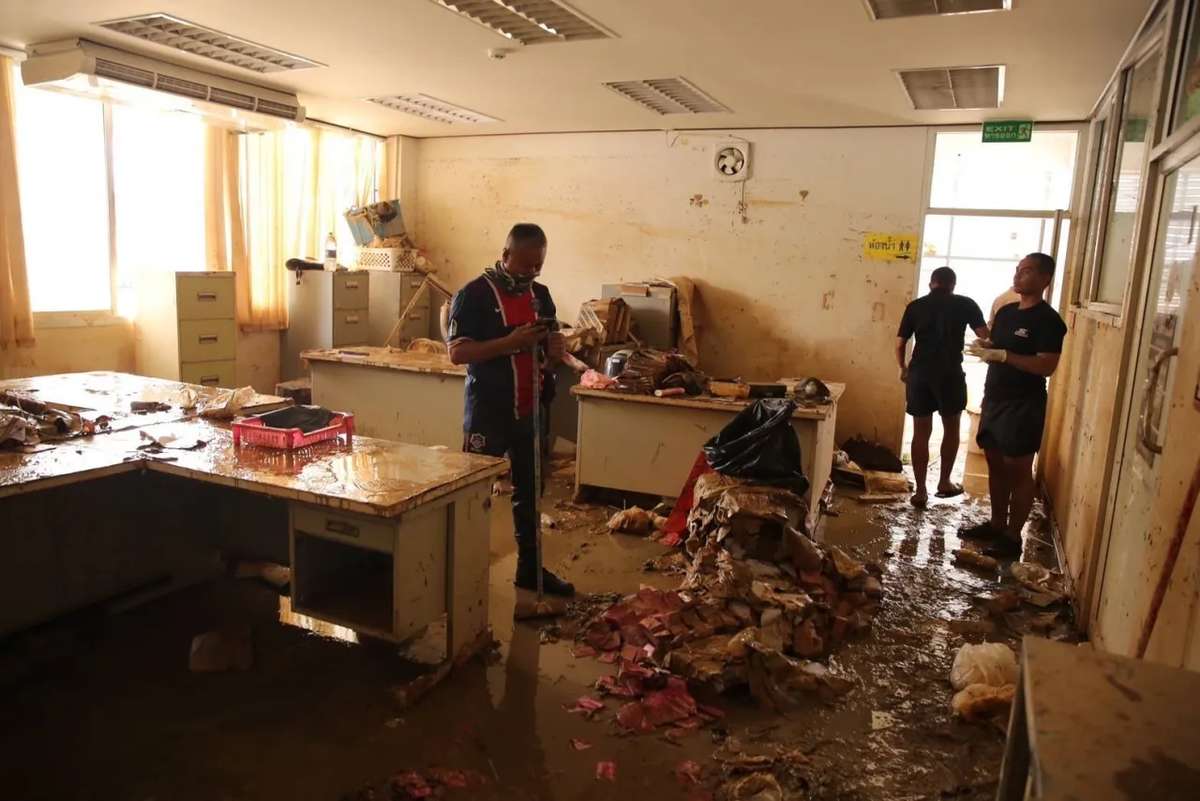 Das Hatyai Hospital hat nach sechs Tagen extremer Überschwemmungen mit umfassenden Aufräum- und Wiederherstellungsarbeiten begonnen. Laut Direktor Dr. Wirot Yommeuang war dies die schwerste Flut seit 15 Jahren und machte sämtliche Bereiche im Erdgeschoss unbenutzbar. Medizinische Geräte und zentrale Funktionen wurden in höhere Stockwerke verlegt.
