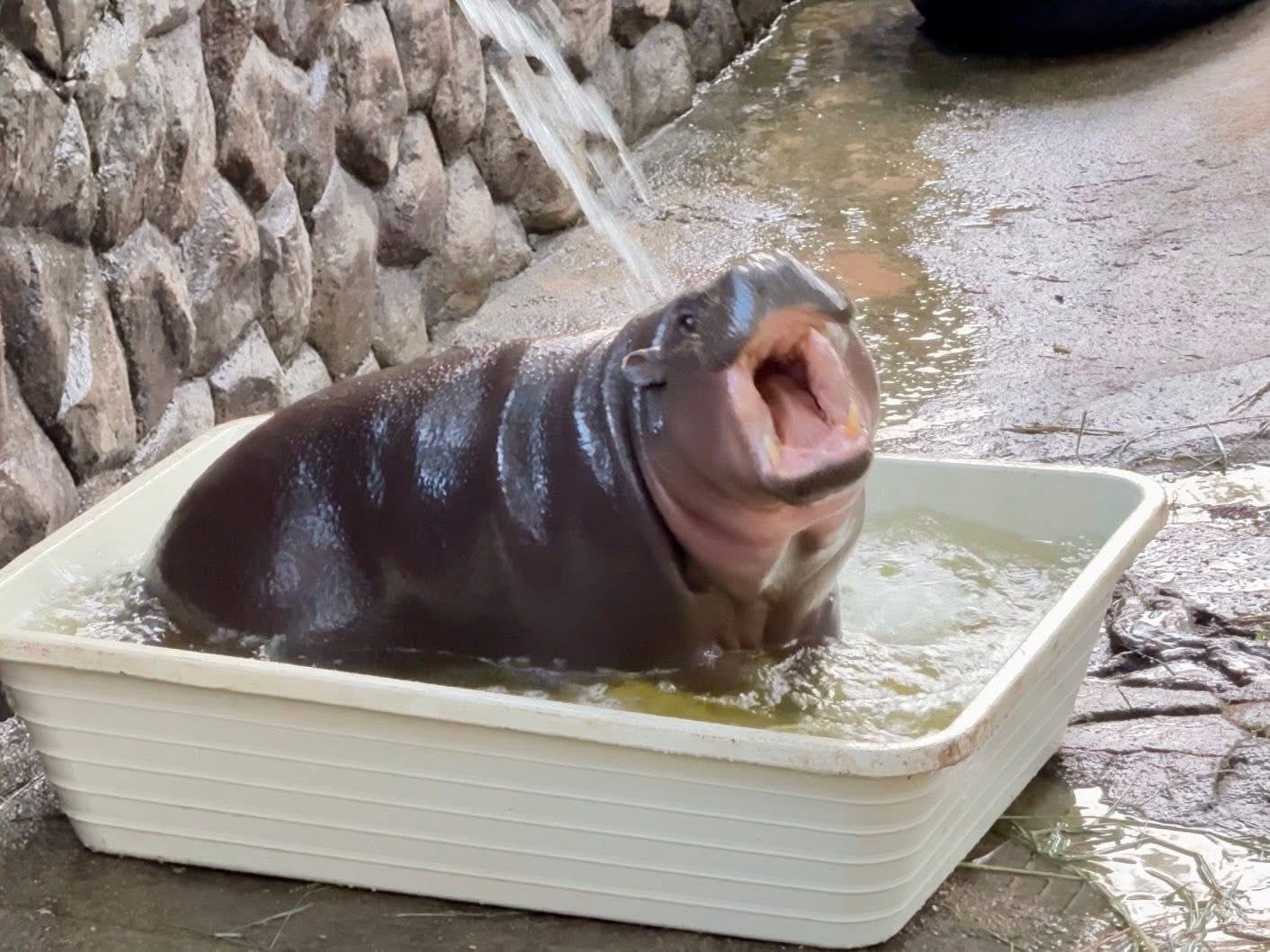 „Sie bemüht sich wirklich, in ihre geliebte Wanne zu passen, obwohl ihr Körper so stark gewachsen ist, dass der Zuber deutlich kleiner wirkt“, sagte er und betonte, Moo Deng tauche trotzdem immer wieder begeistert ein, öffne ihr Maul weit für das Sprühwasser und bewege sich erstaunlich agil im engen Raum.