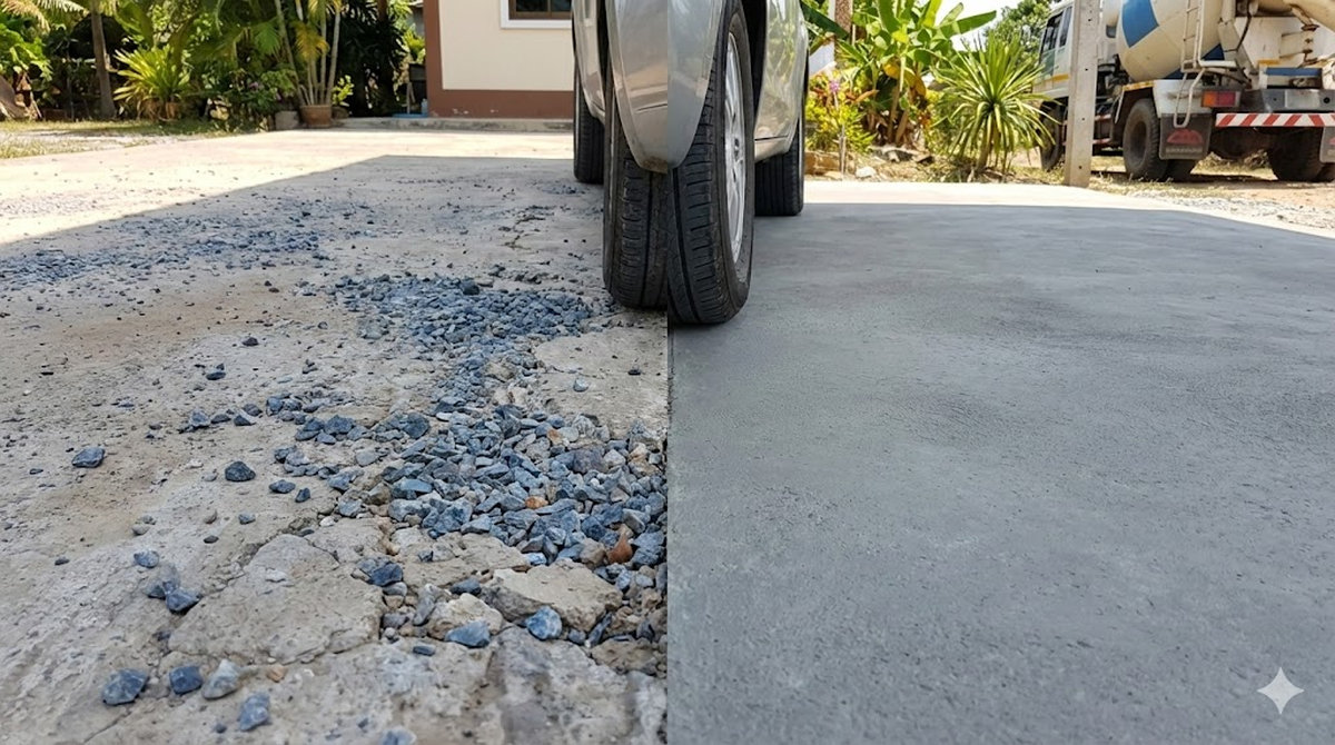 Einer der klarsten Hinweise auf Materialversagen ist, wenn zwei Betonplatten unter identischen Bedingungen gegossen wurden und sich nach wenigen Wochen qualitativ völlig unterschiedlich verhalten. Im Fall einer Einfahrt in Surat Thani aus dem Februar 2026 zeigte sich genau das: Der Beton des lokalen Kleinmischers sandete, der eines größeren Anbieters blieb glatt und fest. Gleicher Untergrund, gleiche Witterung, gleicher Zeitpunkt – nur das Material war verschieden.