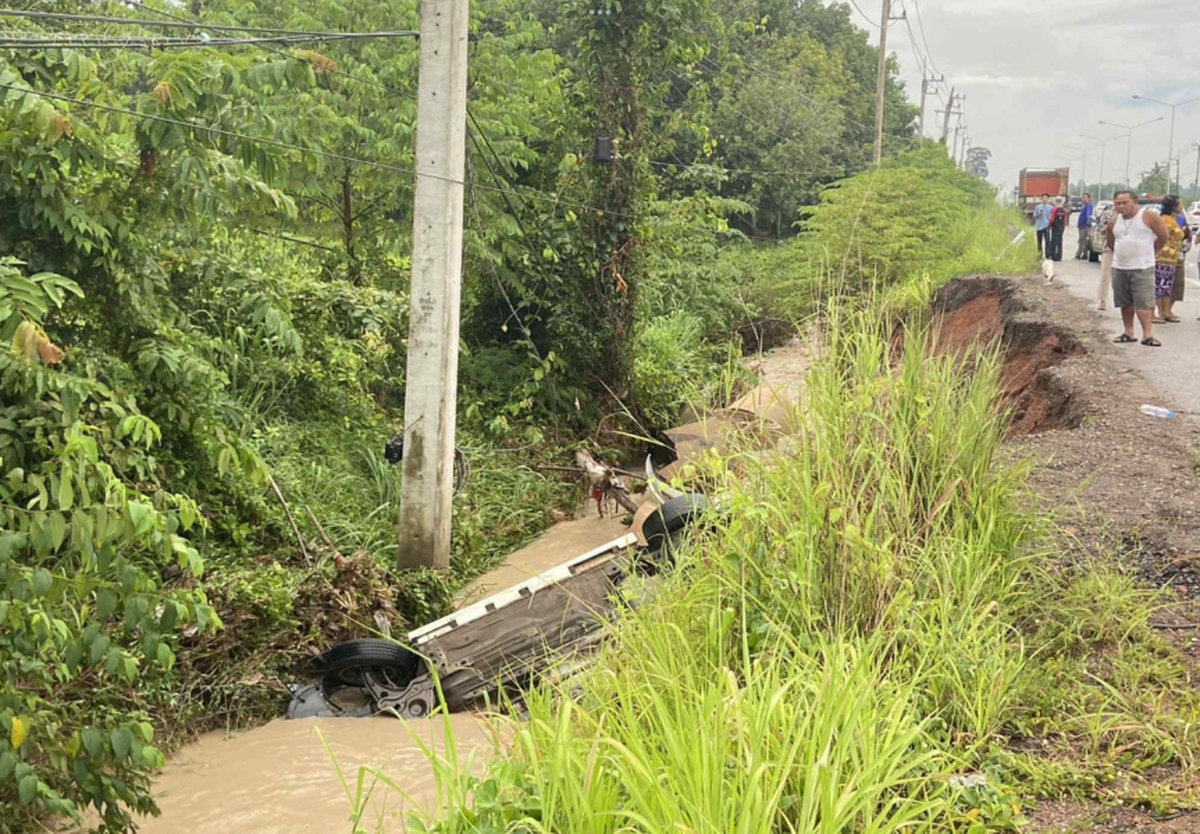 Gegen Nachmittag des 22. August meldeten Anwohner einen schweren Unfall auf der Kalasin-Somdet Straße in der Nähe von Ban Khambon. Ein weißer Pkw war auf der von Regen überspülten Fahrbahn ins Schleudern geraten, hatte einen Strommast gerammt und war dann in einen Entwässerungskanal gestürzt.