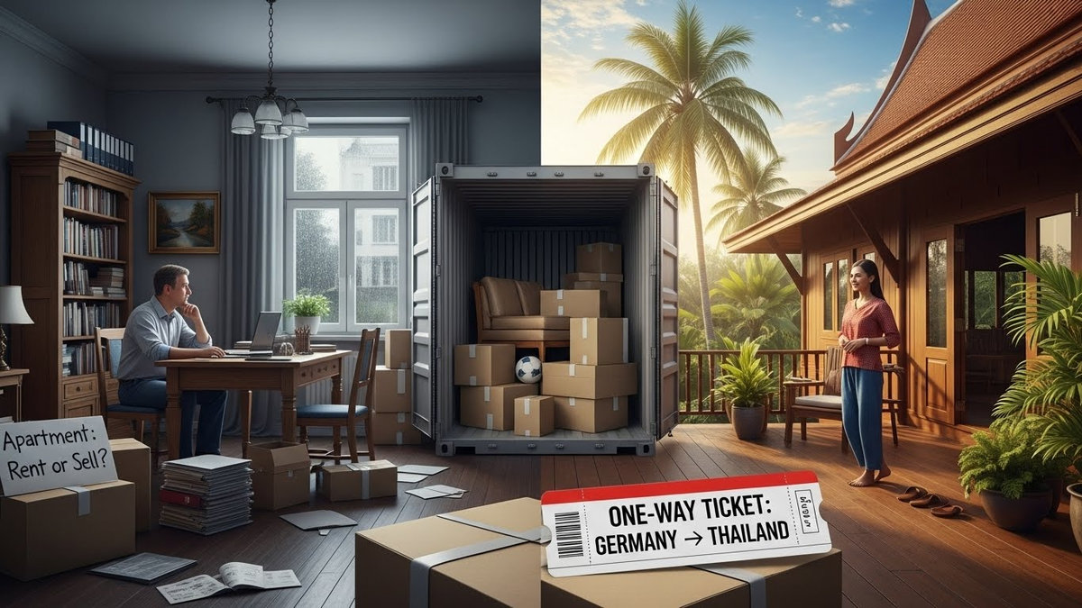 - Er steht vor der Entscheidung, seinen Hausrat zu verschiffen oder zurückzulassen, da die Kosten und der Platz in Thailand begrenzt sind.