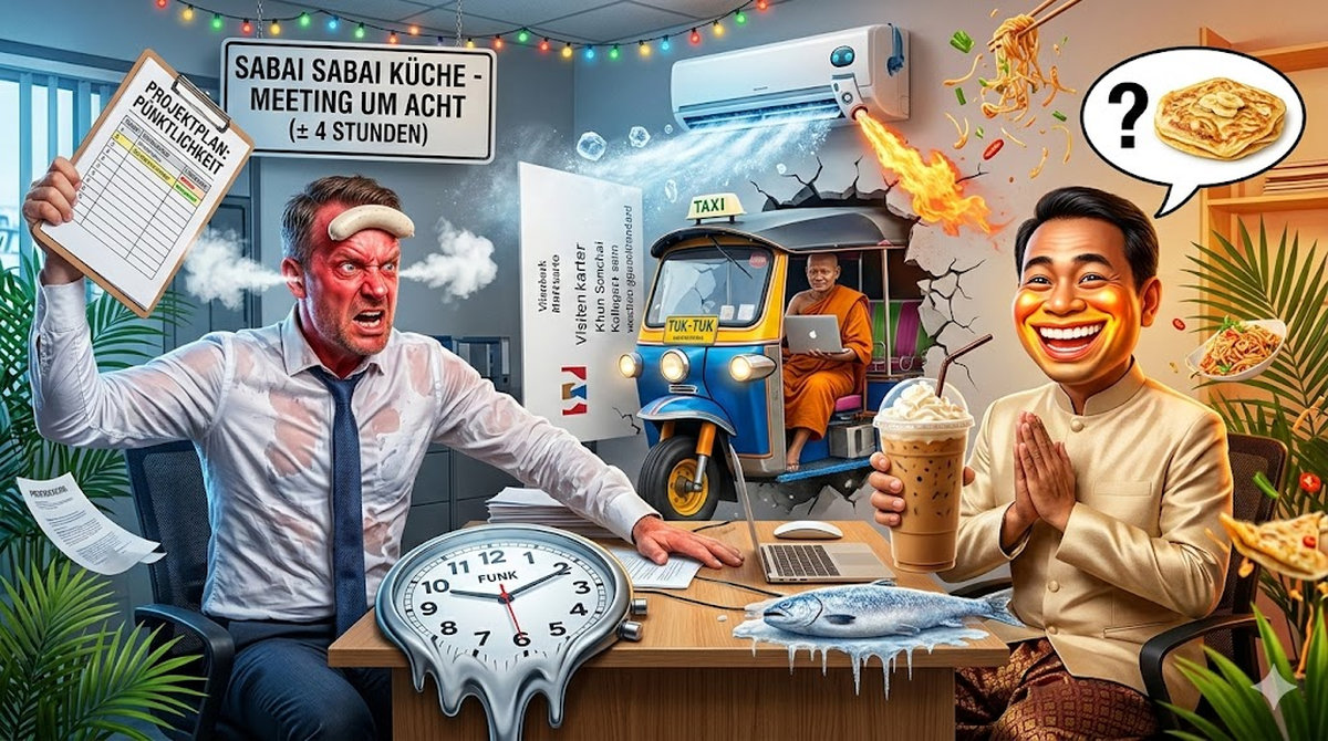 Acht-Uhr-Meeting heißt acht Uhr – oder? Wer auf die Funkuhr pocht, hat die Zeitphilosophie Thailands nicht verstanden. Zeit ist hier keine Linie. Sie ist ein weichgekochter, sehr dehnbarer Nudelstrang, der sich je nach Wetterlage anders verhält.