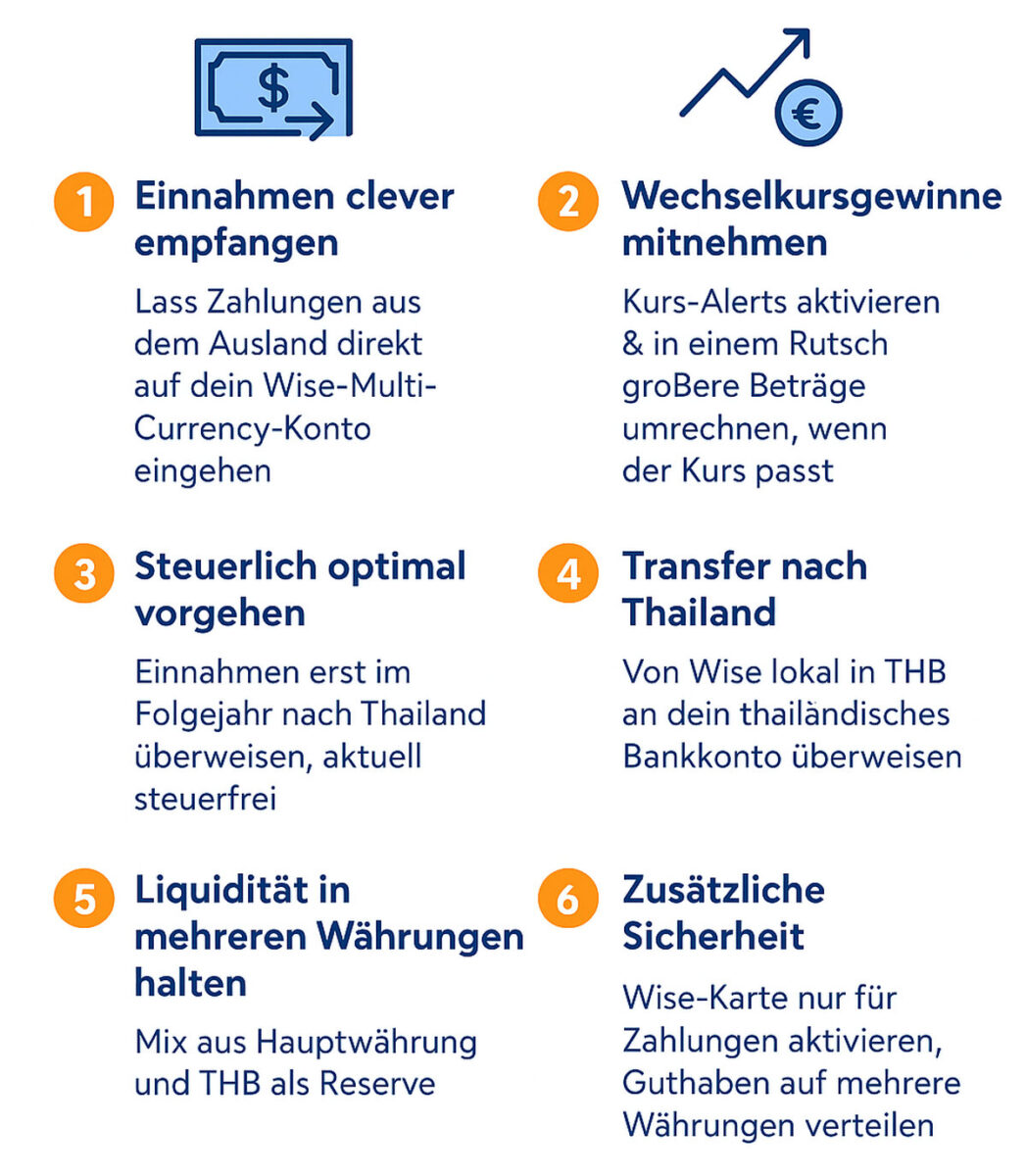 Wichtig für alle, die in Thailand leben oder dort Geld verwalten: Einkünfte aus dem Ausland, die im selben Kalenderjahr nach Thailand überwiesen werden, sind steuerpflichtig. Das steht im Thai Revenue Code (§41). Überweist du das Geld jedoch erst im Folgejahr, ist es aktuell steuerfrei – zumindest nach geltendem Stand 2025. Das kann sich aber jederzeit ändern. Daher lohnt es sich, die Überweisungen gut zu planen und alle Belege und Transaktionsnachweise von Wise sorgfältig zu speichern.