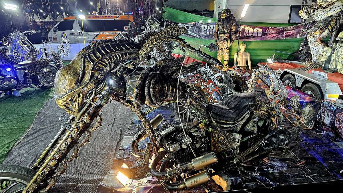 Zwischen den vielen Motorrädern im Club-Bereich entdecke ich immer wieder spektakuläre Metallskulpturen, die aussehen wie aus einem Sci-Fi-Film. Diese beeindruckenden Werke findet man auch schon auf der Allee direkt am Eingang. Sie wurden aus alten Ketten, Zahnrädern und Motorenteilen kunstvoll zusammengeschweißt. Manche sehen aus wie riesige Insekten oder düstere Aliens, andere sind detailgetreue Nachbildungen legendärer Maschinen.