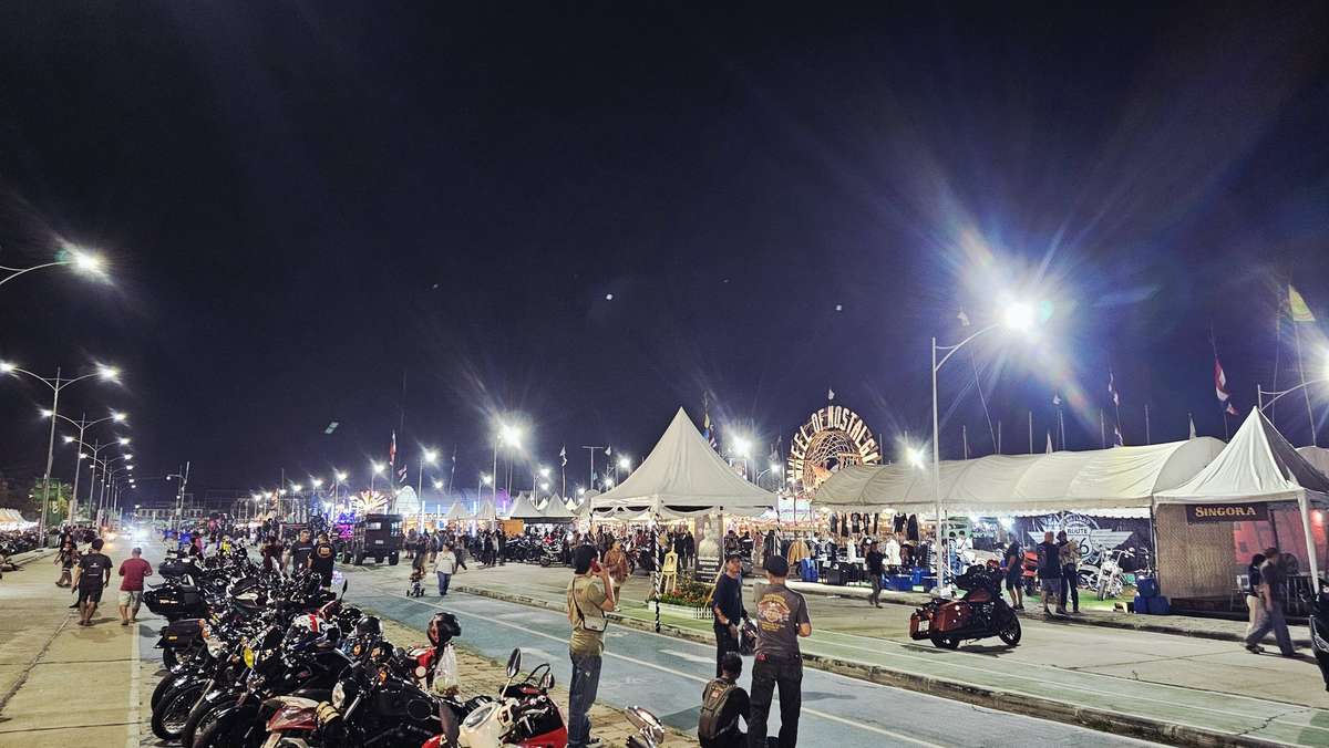 Obwohl man den alten Charme des Parks auf der rechten Seite ein wenig vermisst, ist die Energie auf dieser Allee ungebrochen. Es ist der Puls der Burapha Bike Week. Man merkt sofort, dass die Organisation dieses Jahr auf eine zentrale Achse setzt, die alle Besucher zielsicher zum Herzen des Geschehens leitet. Ich genieße das geschäftige Treiben, während es langsam dunkler wird.