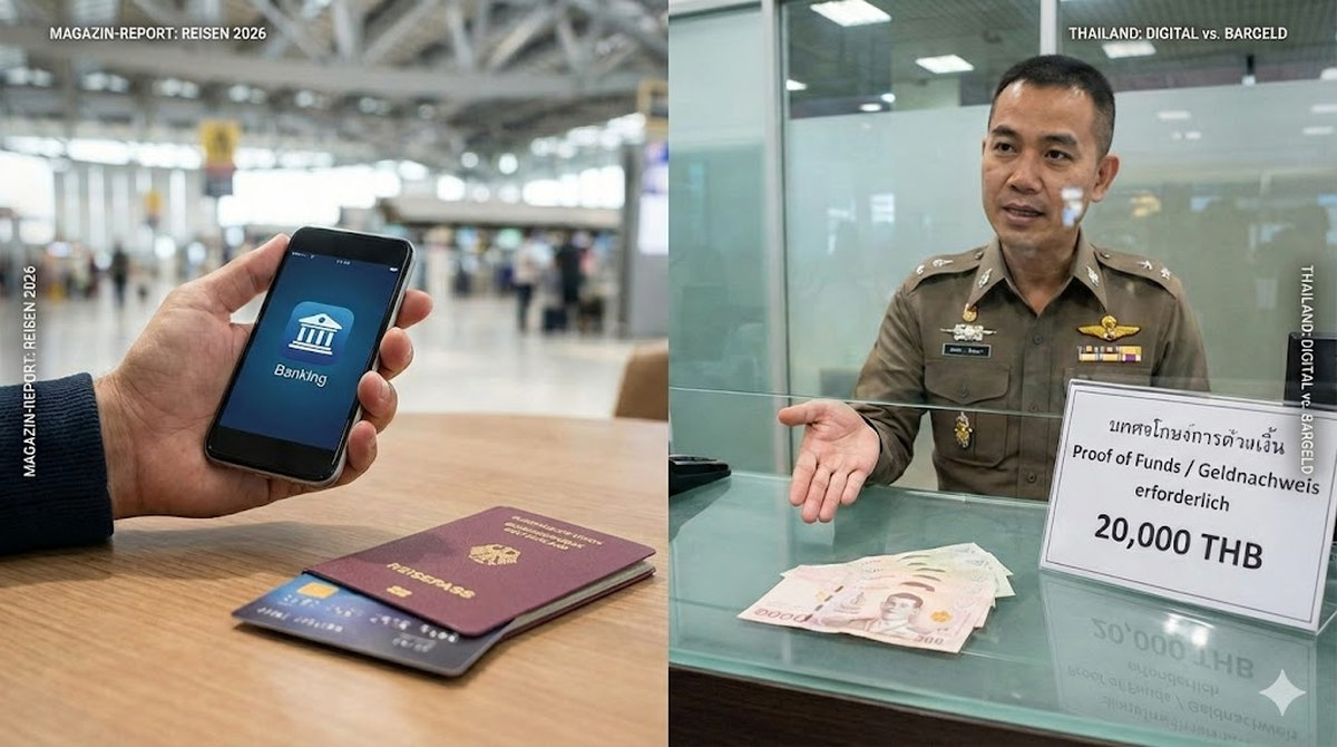 Der Flug ist überstanden, die Koffer warten auf dem Band – und dann kommt die Frage, die viele überrascht: „Show me 20,000 Baht cash, please.“ Der Reisende zückt sein Smartphone, öffnet die Banking-App. Der Beamte schüttelt den Kopf. „Cash only.“
