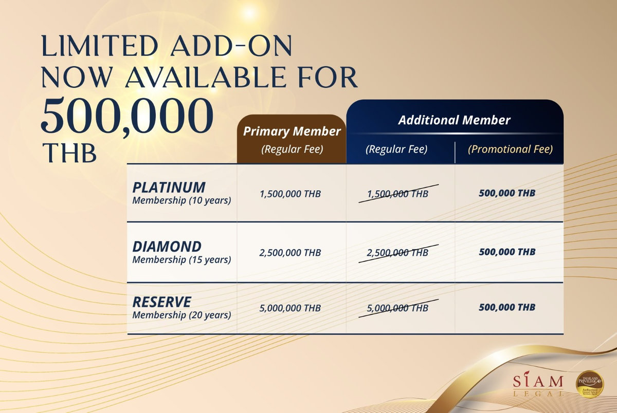 Noch spektakulärer ist der Familien-Rabatt für die Premium-Kategorien: Bis zum 30. September 2025 können neue und bestehende Mitglieder der Platinum-, Diamond- oder Reserve-Kategorien Familienangehörige für nur 500.000 Thai Baht (etwa 13.000 Euro) pro Person hinzufügen. Früher kosteten diese Add-On-Gebühren für die Premium-Kategorien zwischen 1,5 und 5 Millionen Thai Baht – das bedeutet Rabatte von bis zu 90 Prozent!