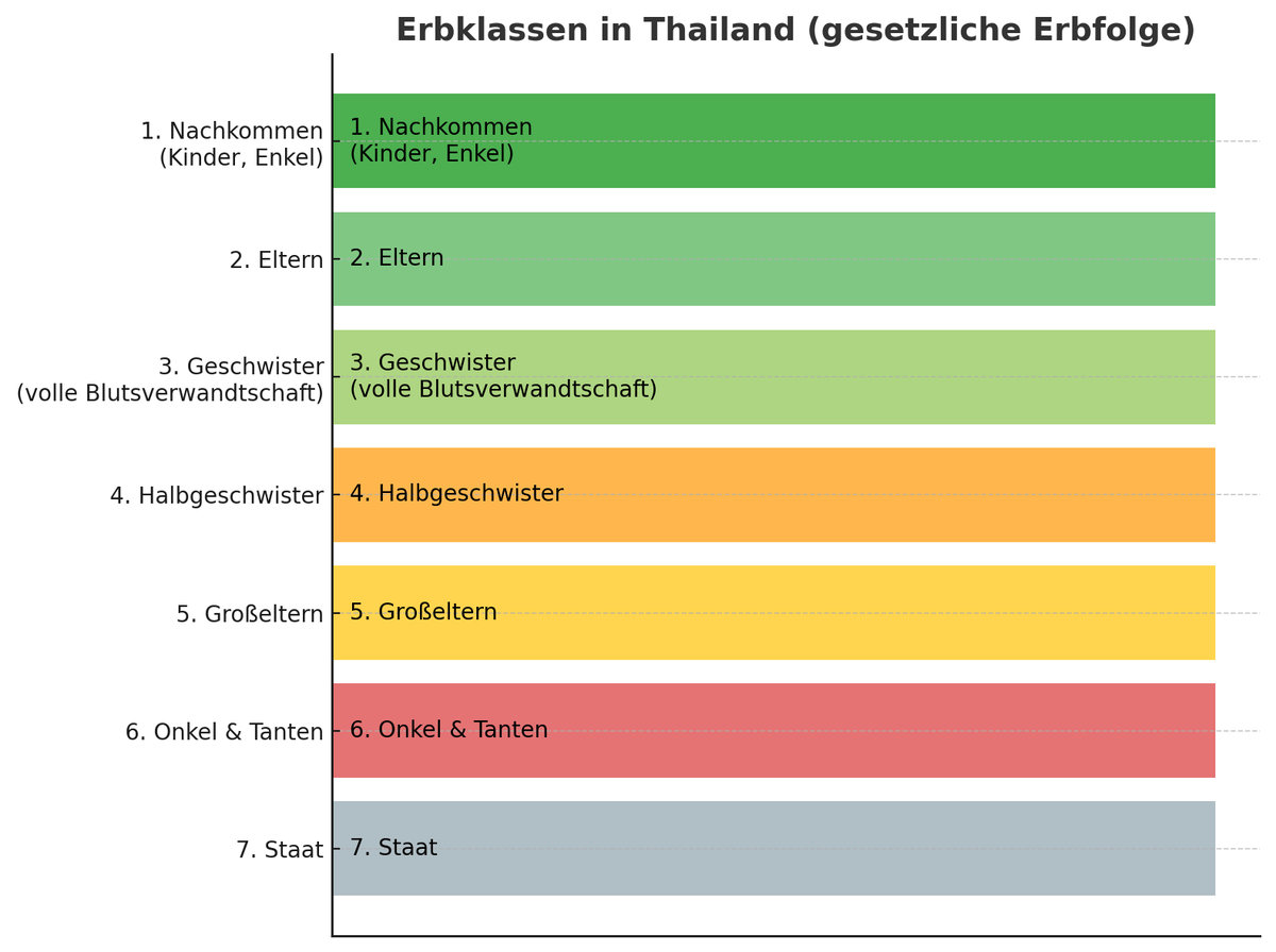 Das thailändische Recht unterscheidet sieben Erbklassen. Eine niedrigere Klasse erbt nur, wenn es keine Angehörigen einer höheren Klasse gibt.