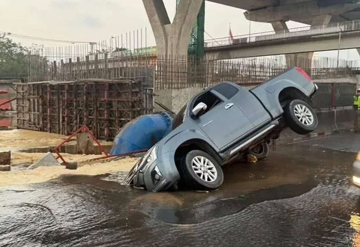BANGKOK/SAMUT SAKHON – Ein Albtraum für Pendler: Auf der ohnehin schon geplagten Rama II Road hat sich am frühen Morgen ein riesiges Erdloch aufgetan. Ein Pick-up wurde fast verschluckt, eine Wasserleitung barst – das Verkehrschaos ist perfekt.