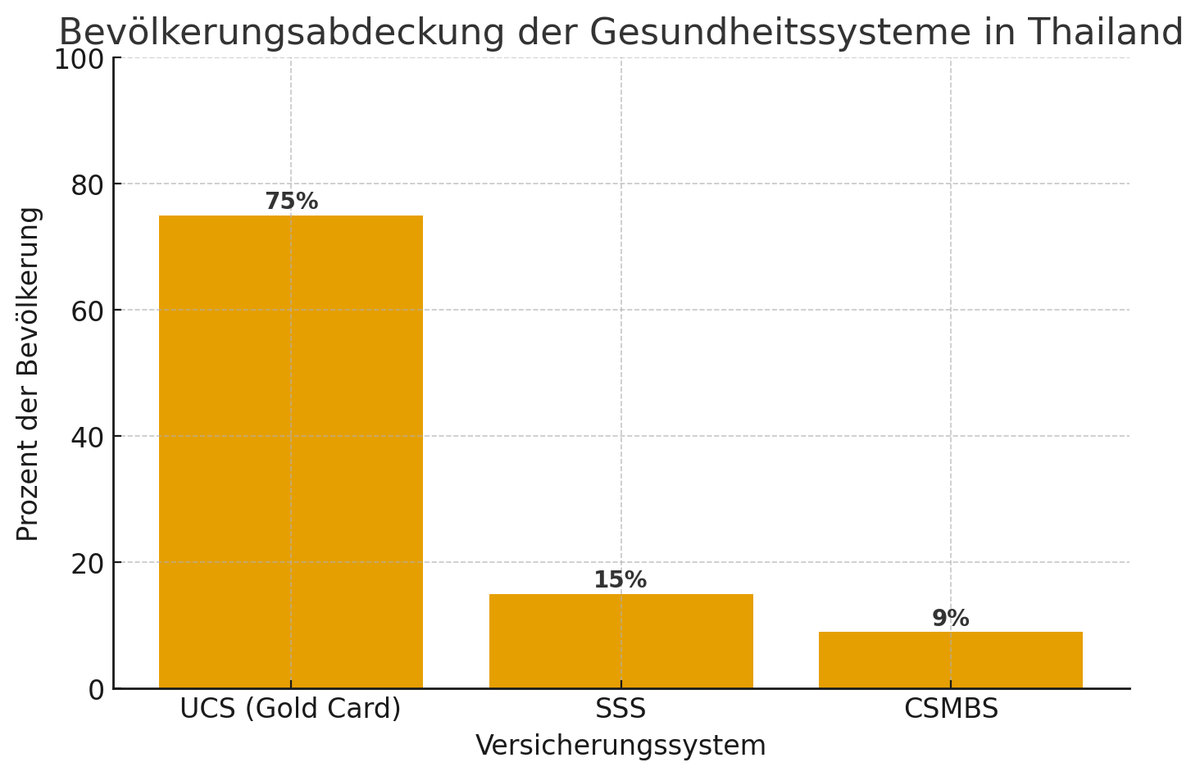 | Merkmal | Universal Coverage Scheme (UCS / Gold Card / 30-Baht-Programm) | Social Security Scheme (SSS) | Civil Servant Medical Benefit Scheme (CSMBS) |